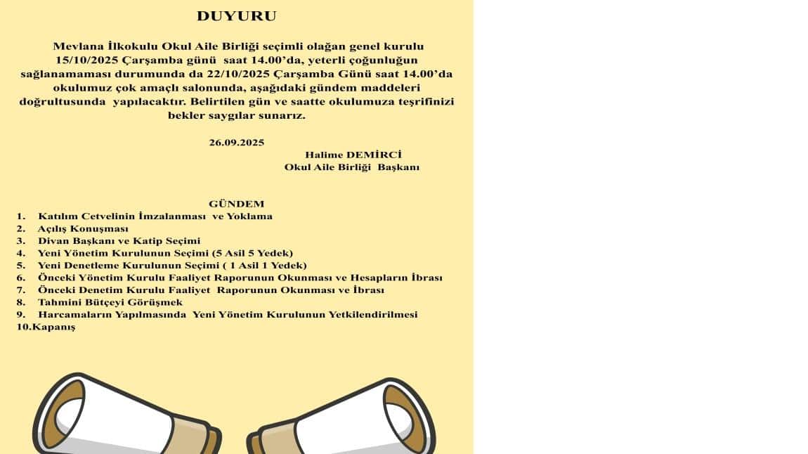 Mevlana İlkokulu Okul Aile Birliği seçimli olağan genel kurulu 15/10/2025 Çarşamba günü saat 14.00’da, yeterli çoğunluğun sağlanamaması durumunda da 22/10/2025 Çarşamba Günü saat 14.00’da okulumuz çok amaçlı salonunda, aşağıdaki gündem maddeleri doğrultusunda yapılacaktır. Belirtilen gün ve saatte okulumuza teşrifinizi bekler saygılar sunarız.